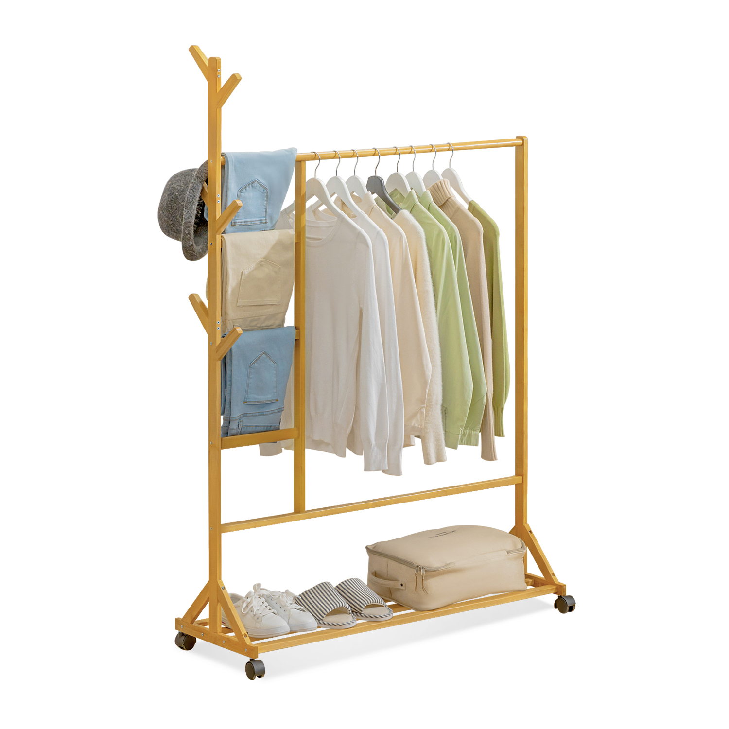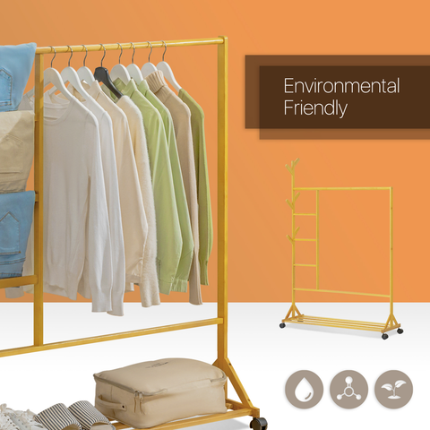 Humanization design makes this furniture beautiful and multifunction: Hanging up your trousers instead of tucked away in drawers. The bars beside are a handy place to hang your towels or hats. The layer below is convenient for your shoes, slippers, or storage bags. Founded atop a four-wheel rolling base, it can easily be moved throughout your master suite as you're getting ready. All this makes this rack a piece of practical and beautiful furniture in your bedroom, if you want to add some fresh looks to your home, just try this clothes rack.