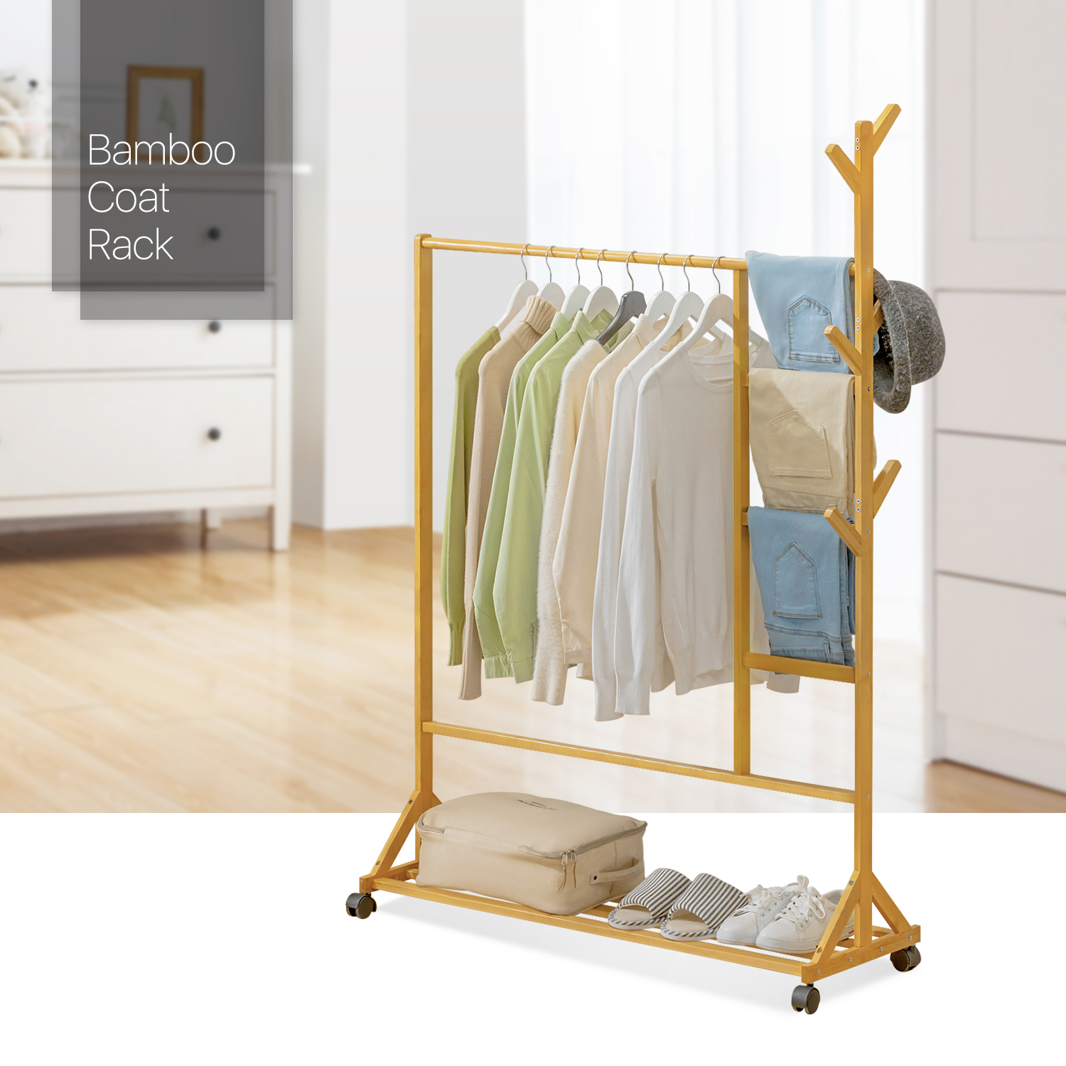 Want to tidy up your bedroom and let all your clothes collect in order? Our clothes rack built-in high-quality bamboo will give you a hand. Premium bamboo rack, considers your health problems, and water-proof surface in natural coating shows an elegant appearance.