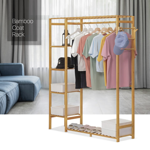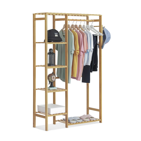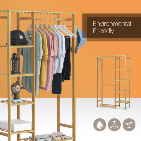 Want to tidy up your bedroom and let all your clothes collect in order? Our clothes rack built-in high-quality bamboo will give you a hand. Premium bamboo rack, considers your health problems, and water-proof surface in natural coating shows an elegant appearance. Humanization design makes this furniture beautiful and multifunction: The bars beside are a handy place to hang your towels or trousers.