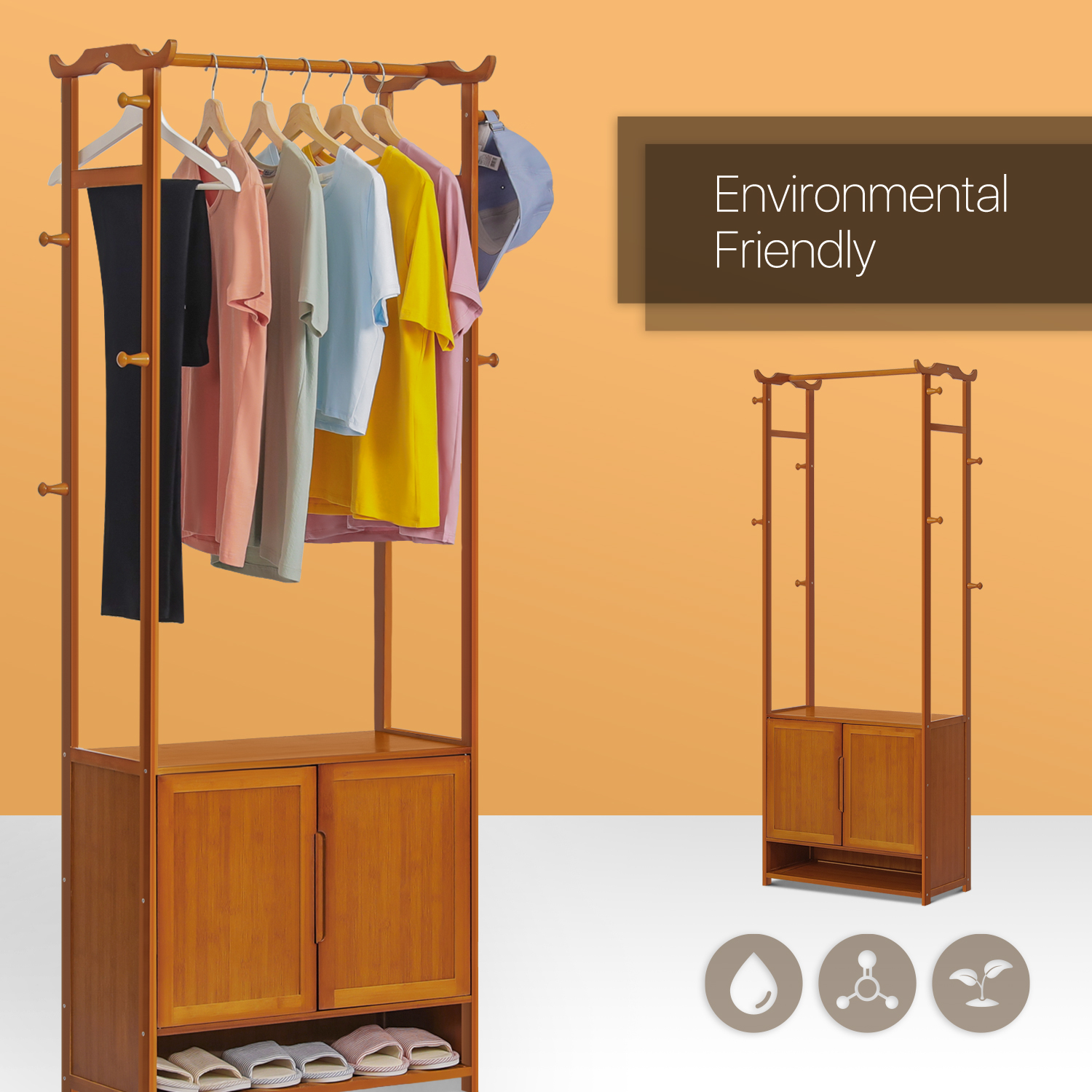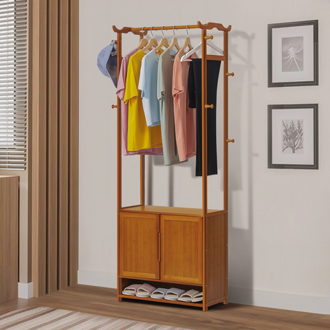 Want to tidy up your bedroom and let all your clothes collect in order? Our clothes rack built-in high-quality bamboo will give you a hand. Premium bamboo rack, considers your health problems, and water-proof surface in brown coating shows an elegant appearance. Humanization design makes this furniture beautiful and practical: Hanging up your clothes instead of tucked away in drawers. The bars beside are a handy place to hang your hats, handbags, or scarves.