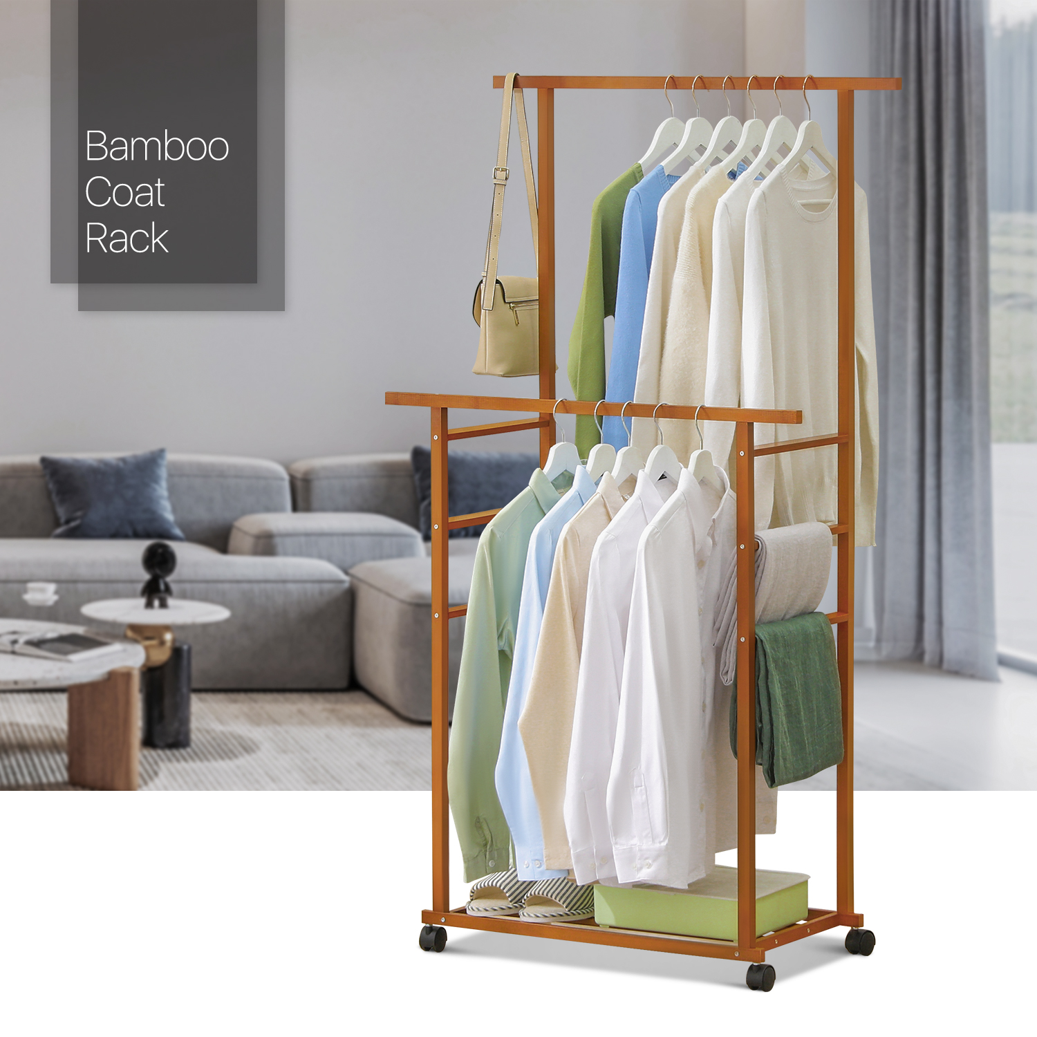 Tidy up your messy clothes and bring a fresh look to your bedroom. Compared to a traditional wardrobe, this coat rack on a brown coating bamboo surface provides a convenient closet solution for small spaces and brings an elegant appearance to your home.