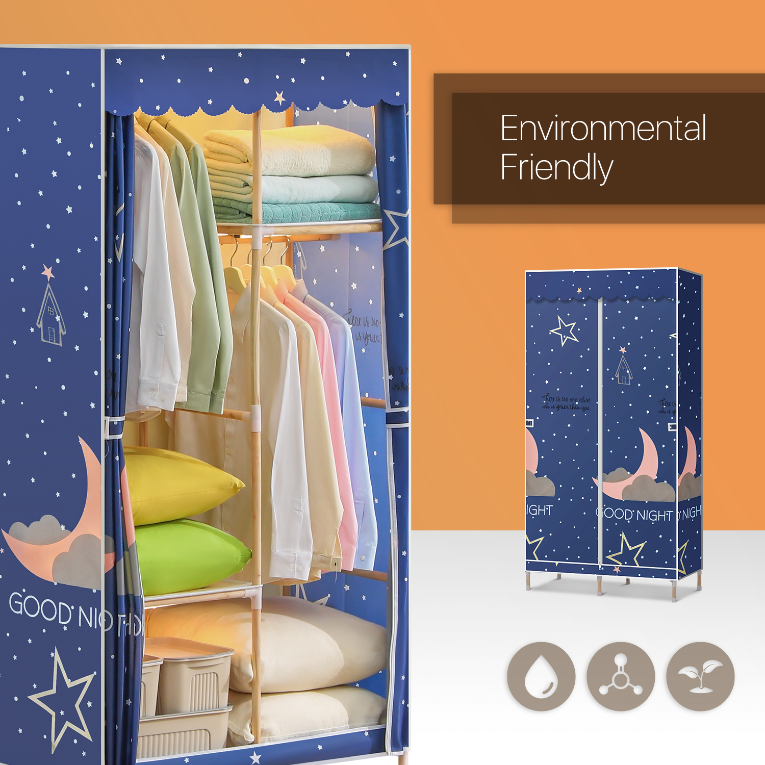 Want to place your clothes and bedding in another way, just try our beautiful clothes shelf. Compared to a traditional wardrobe, this wooden clothes organizer aims for your comfortable life in a concise style. Fabric cover with the pattern of stars adds a fresh look to your bedroom, also prevents the dust from dropping onto your items.