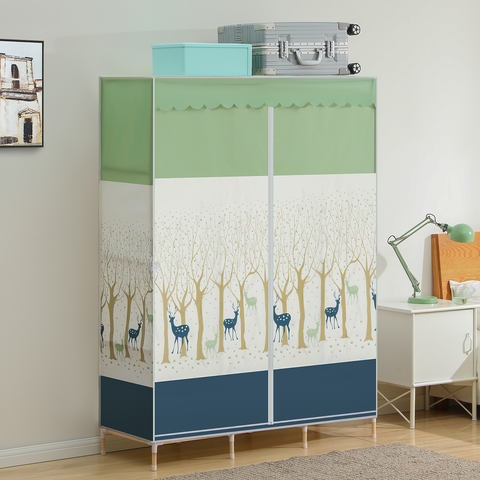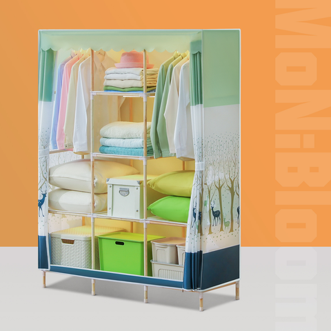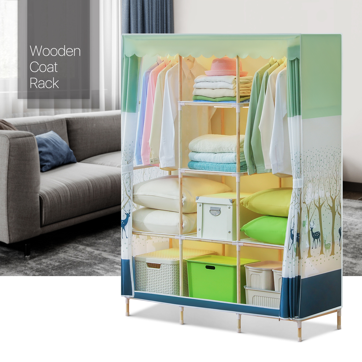Want to place your clothes and bedding in another way, just try our beautiful clothes shelf. Compared to a traditional wardrobe, this wooden clothes organizer aims for your comfortable life in a concise style. Fabric cover with the pattern of forest adds a fresh look to your bedroom, also prevents the dust from dropping onto your items.