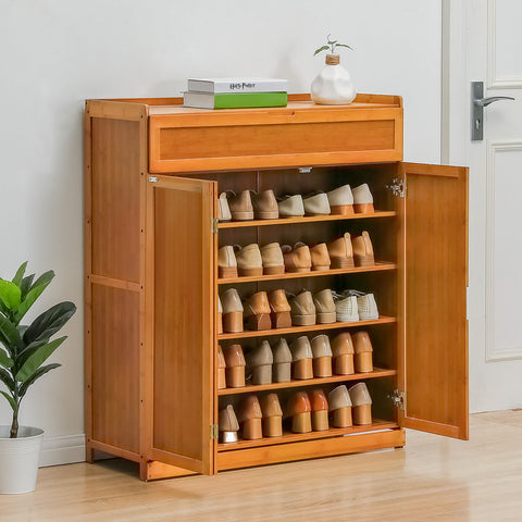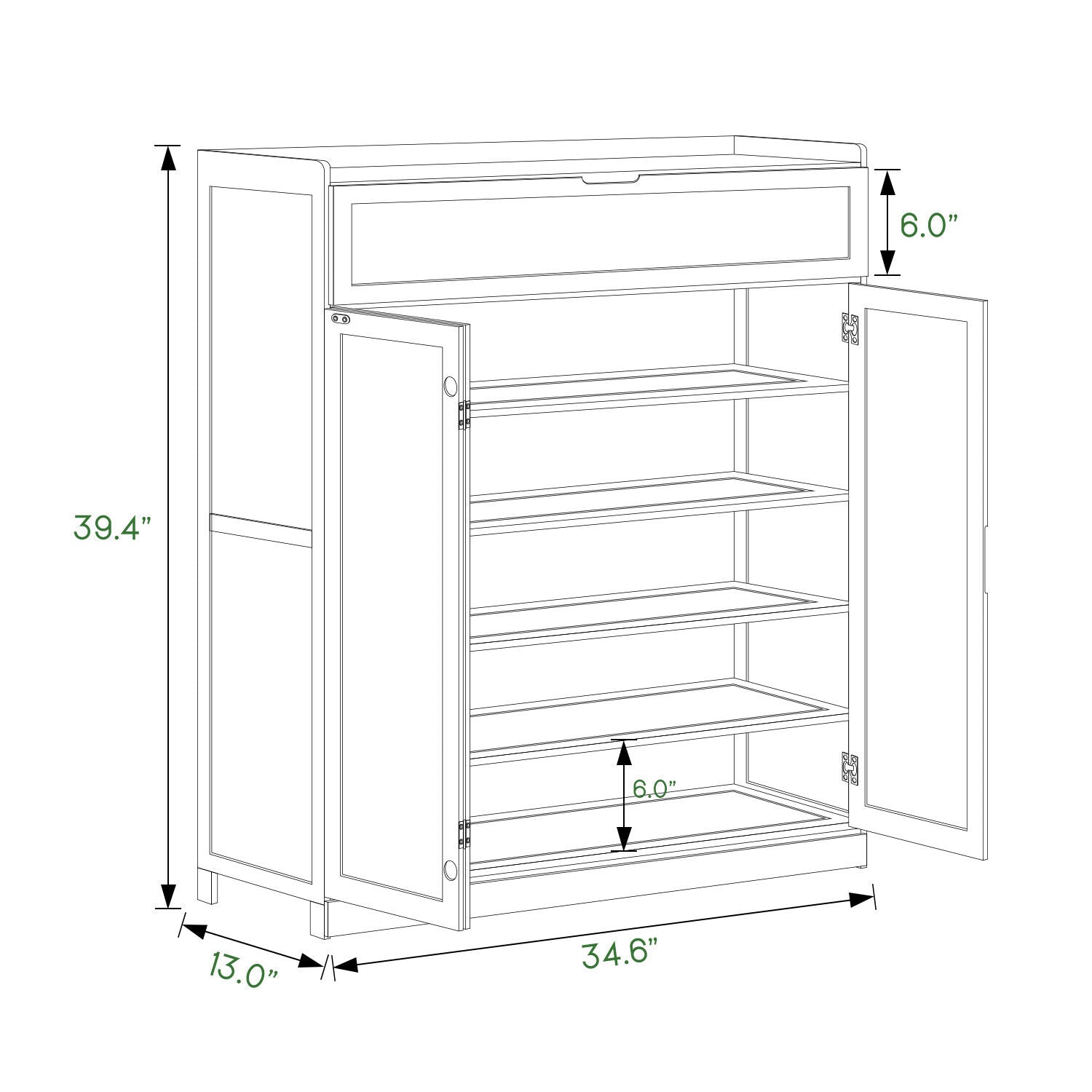 This two-door shoe cabinet with backboards provides an enclosed space to keep your shoes clean. The drawer is a handy place to put your on-the-go items like your keys or purse. The top area is ideal for your preferred decorations like a plant, framed photo to make your entryway a personalized look. Make this fresh, natural look shoe cabinet an elegant decoration in your entryway.