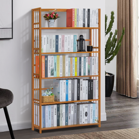 This five-decker bamboo bookshelf provides an extra platform to collect your books. Premium bamboo in natural surface shows an elegant appearance, with this stand bookshelf you can decorate your room in a personalized way.