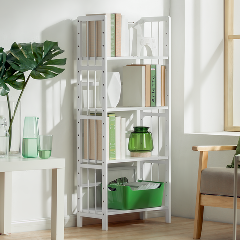 This four-decker bamboo bookshelf provides an extra platform to collect your books. White coating surface in concise design makes your room more ethereal and relaxing. Premium bamboo in the simple design shows an elegant appearance, with this stand bookshelf you can decorate your room in a personalized way.