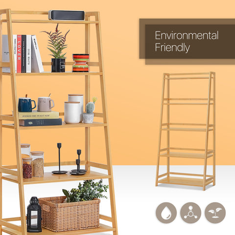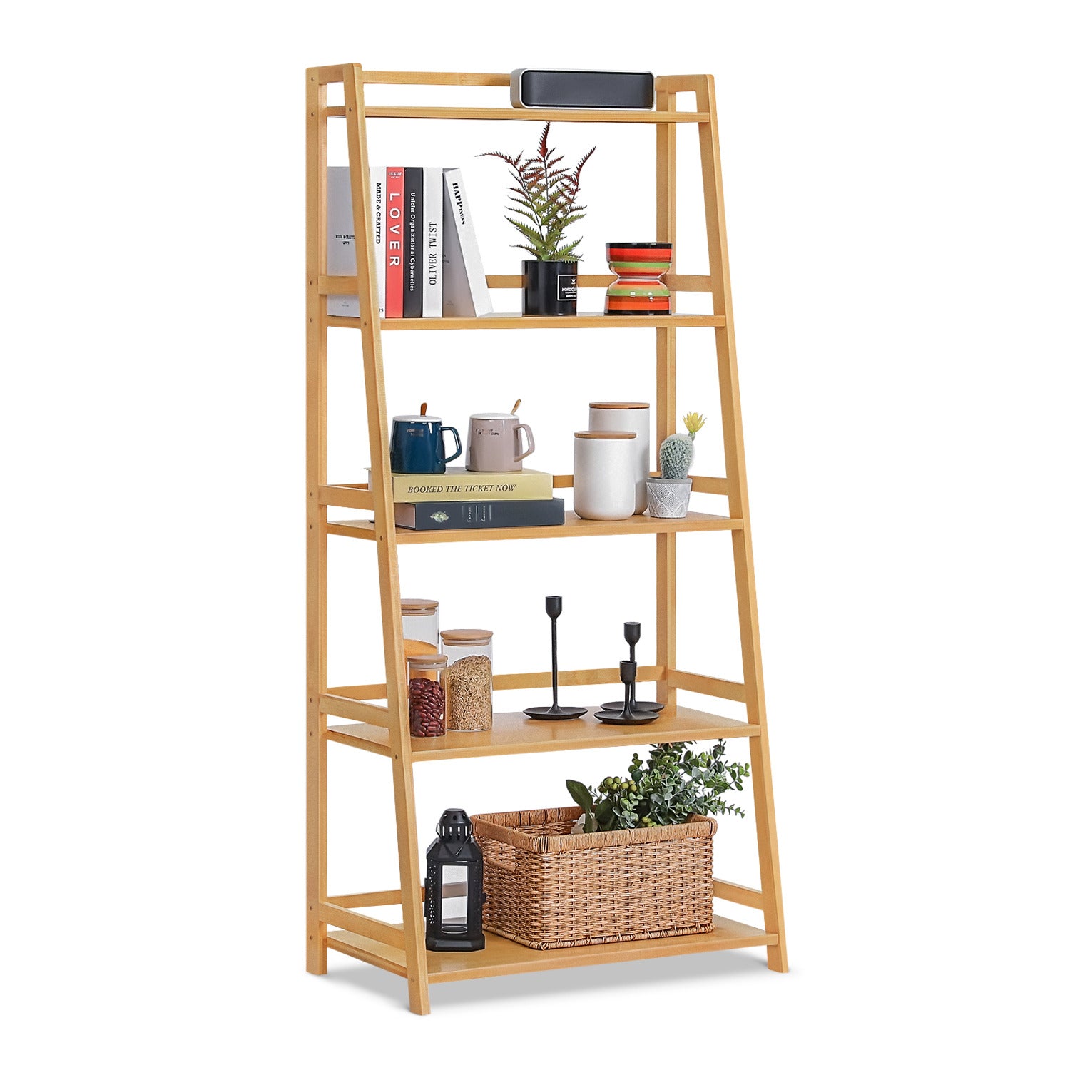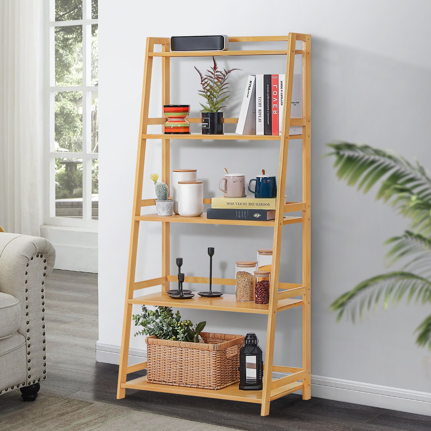 This five-decker trapezoid bookshelf provides an extra platform to collect your books. Premium bamboo in natural surface shows an elegant appearance, with this floor-standing bookshelf you can decorate your room in a personalized way.
