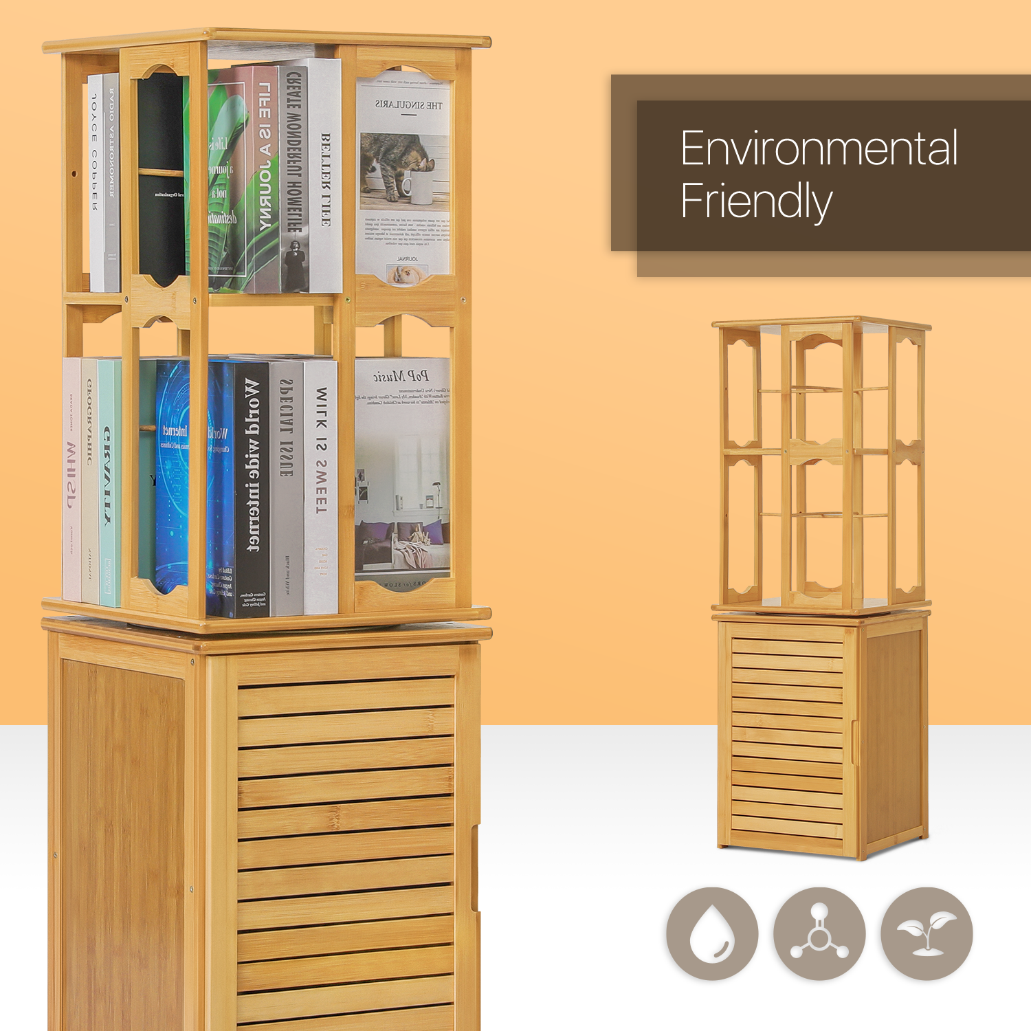 - Revolving Bookcase - The unique design of rotating bookshelf allows you to easily access items from all angles. It is a four-side open bookcase that can house a selection of books on each side.
