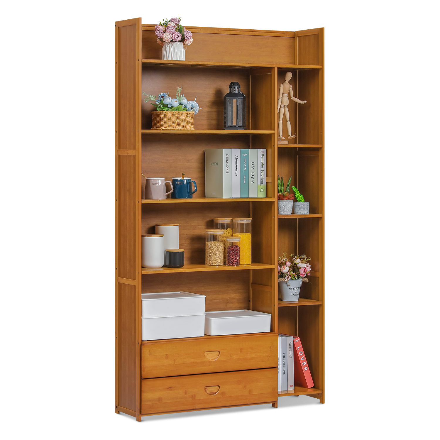Want to tidy up your living room and have a concise style of view? Just try this bamboo stand shelf. Natural surfaces and clean lines bring you relaxation in an elegant appearance. With its irregular layers design and large capacity, this shelf can contain many daily items like books, cups even some flowers for decoration.