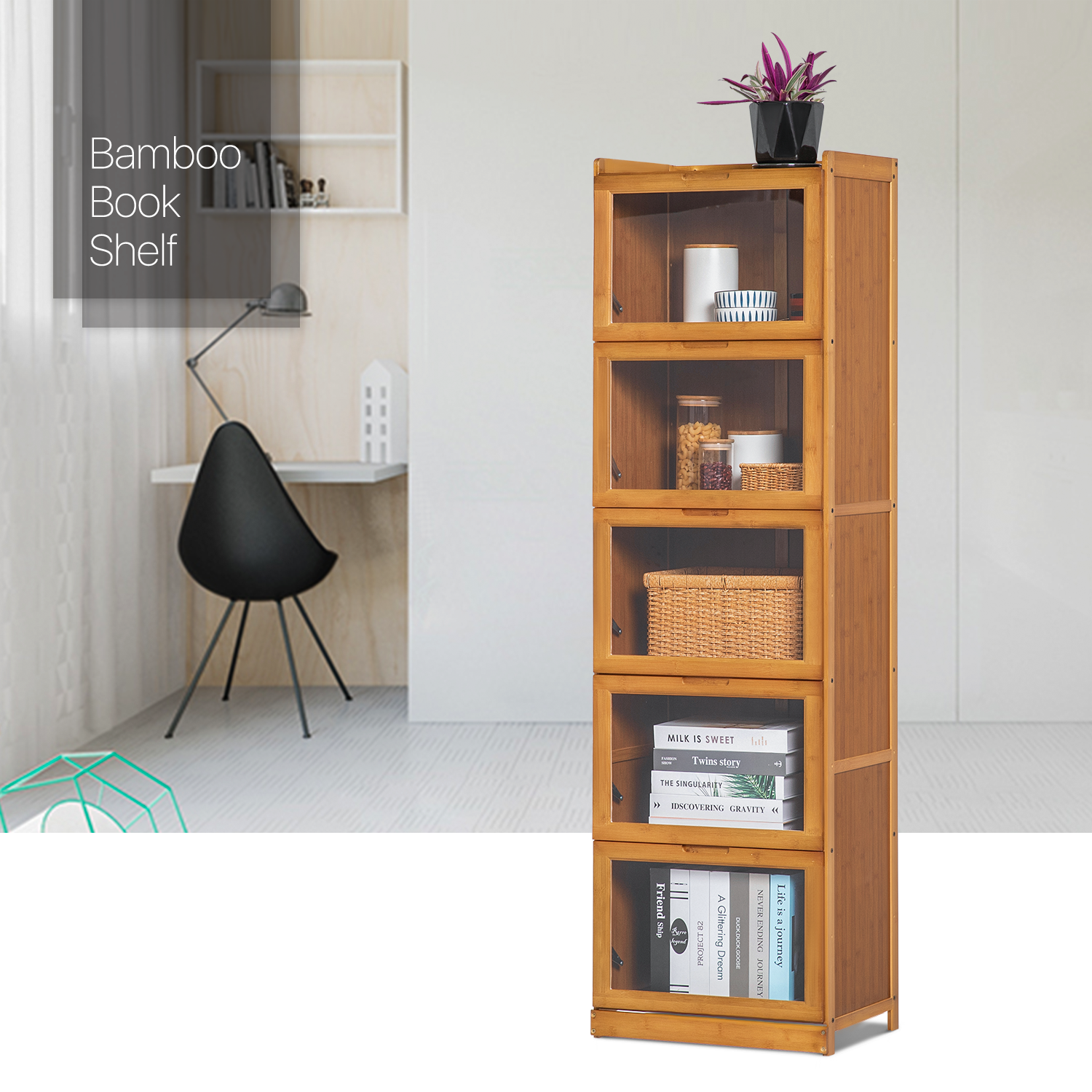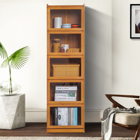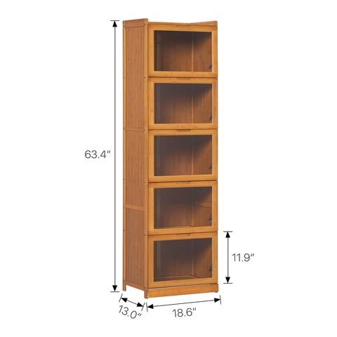 Want to bring order to a messy place and add the beauty of nature to your room? This five-decker bamboo storage cabinet features clean lines and a concise style that brings an elegant appearance and classic sense to your home. The drop-down style Acrylic door takes water-proof and dirt-proof into consideration, creates an enclosed space to store your household items without damage. This see-through design lets you conveniently find the items in the cabinet, you can also show off your favourite accent pieces through this transparent lid.