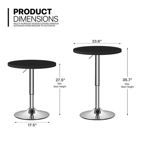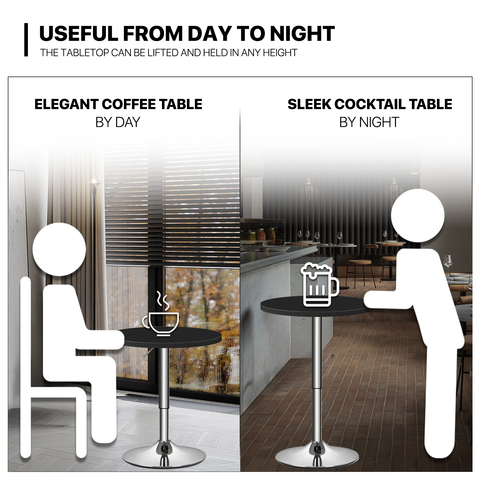 This adjustable height pedestal table will make a spectacular statement piece in your venue. The height adjustable frame adjusts from standard table height to counter height with the handle located under the top.