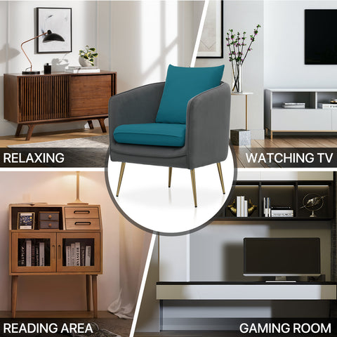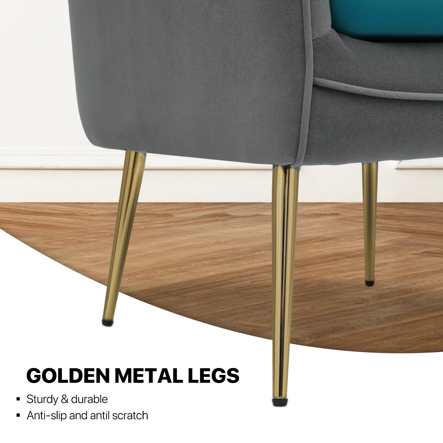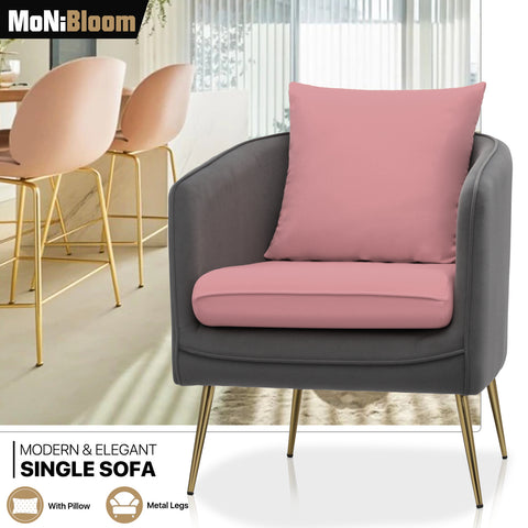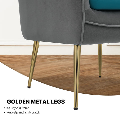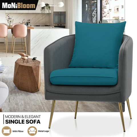 This single sofa chair is designed for comfort and style with its armrest and cushioned seating. Its solid wood frame provides durability and stability, while the golden metal legs add a touch of elegance and sophistication.