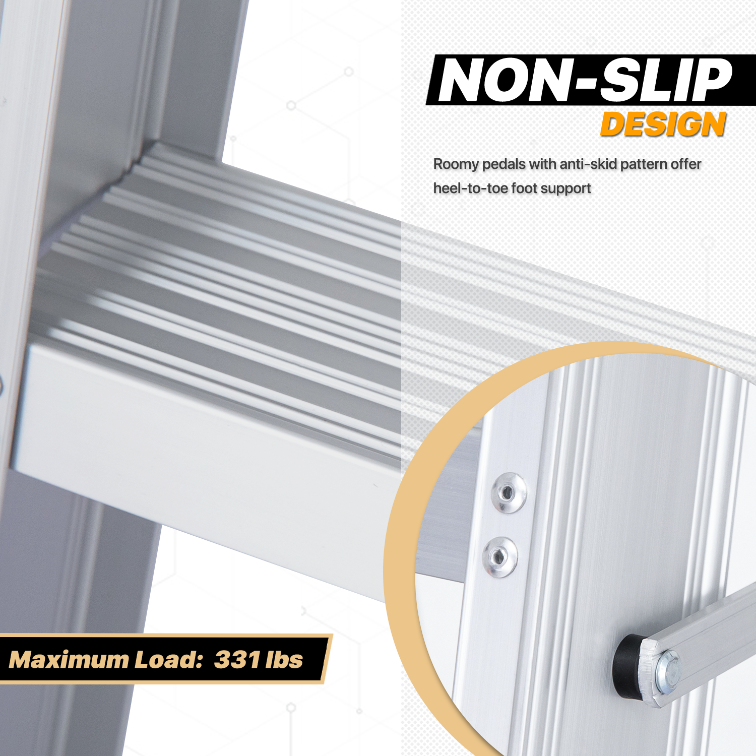 - Reinforced Security Rungs - It reaches up to 331 pounds support when standing on this slip-resistant steps. These wide steps not only make climbing more stable but also a lower possibility of sore and fatigued feet in all-day projects.