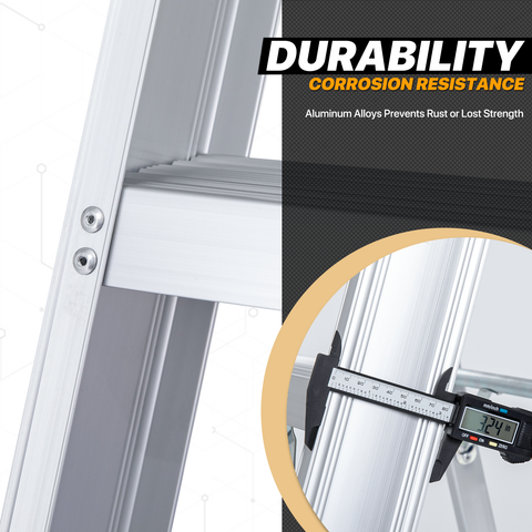 Available in many different sizes and configurations, a ladder is a must-have item for homeowners, handypeople, and construction professionals alike. If you need extra height for outdoors working our stepladders could be your smart choice. Due to the corrosion-resistant aluminum alloy structure, this ladder is lightweight and portable. Reinforce side slats on the top and bottom make the ladder have a stronger load ability. The top handle helps to maintain balance and saves trips up and down your ladder by keeping frequently-used tools at your fingertips with the built-in tool caddy. For safety measures, A-shaped frames that self-support on four legs, also with the anti-slip base cap, allows you to balance the ladder on a staircase or other uneven surface.