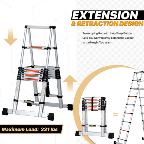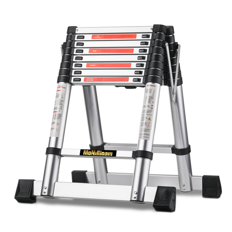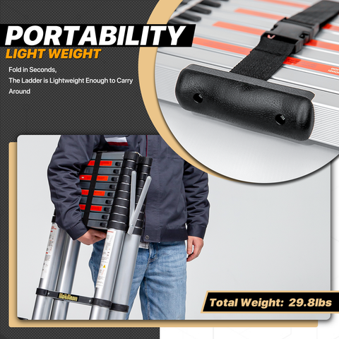 If you need extra height for outdoors working and get tired of bringing your bulky, unwieldy ladder around, our extension ladder could be your smart choice. This telescoping ladder is an extension ladder that can easily collapse when not in use for easier storage, also you can adjust the height of the ladder quickly and conveniently. Thanks to the corrosion-resistant aluminum alloy structure, this ladder considering lightweight and portable. Benefitting from the collection strap and grip handle, the ladder is convenient to carry around. For safety measures, A-shaped frames that self-support on four legs, also with the anti-slip base cap, allows you to balance the ladder on a staircase or other uneven surface.