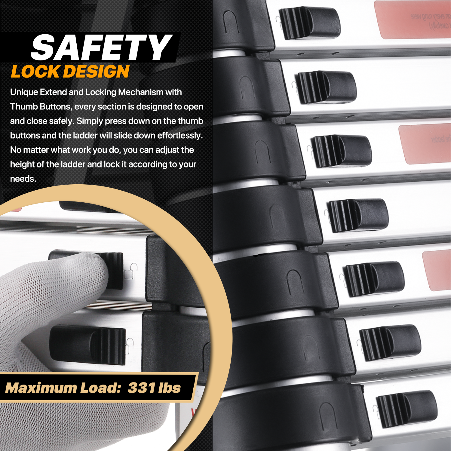 - Adjustable Height - Telescoping rod with easy snap button enables you extend the ladder to the height you expect.