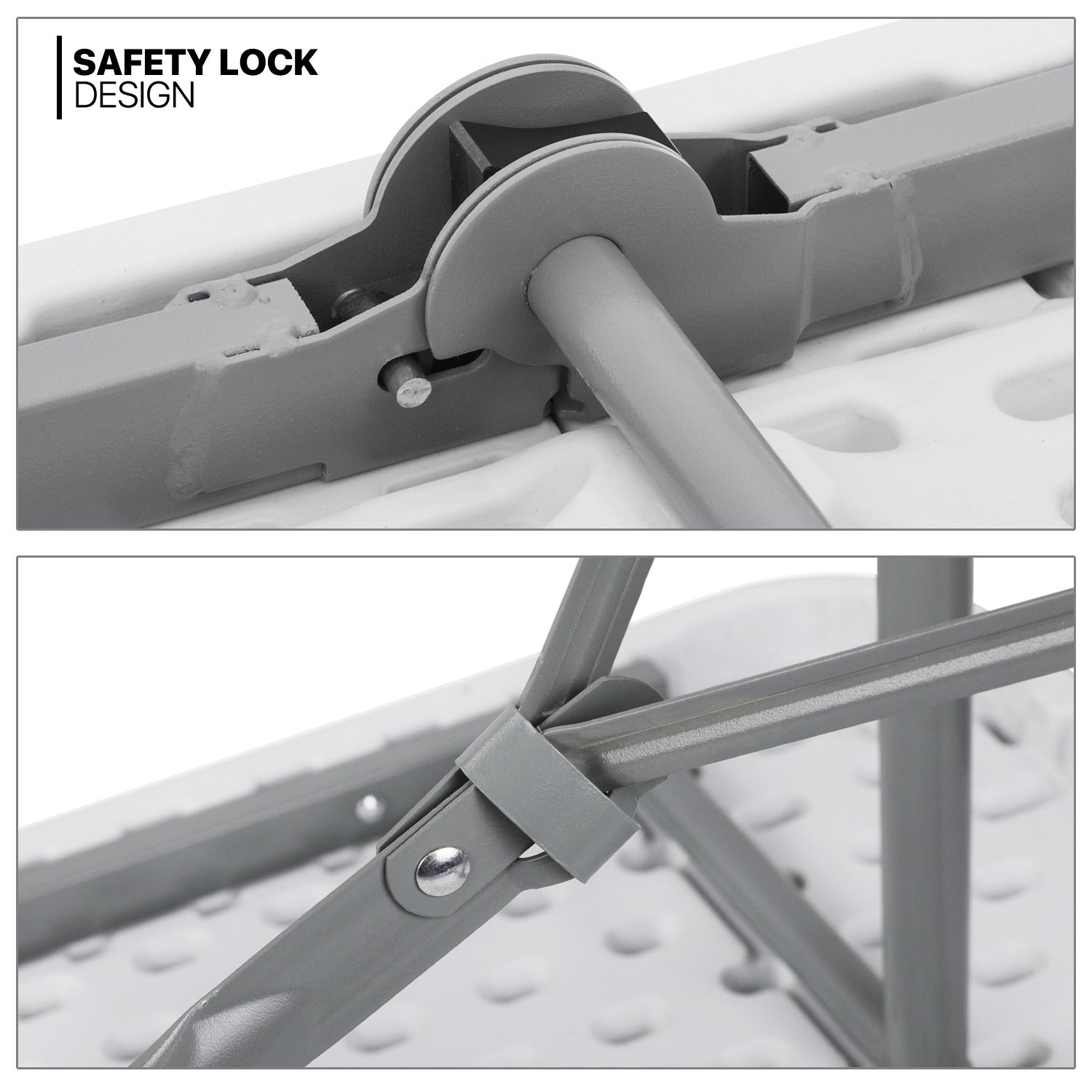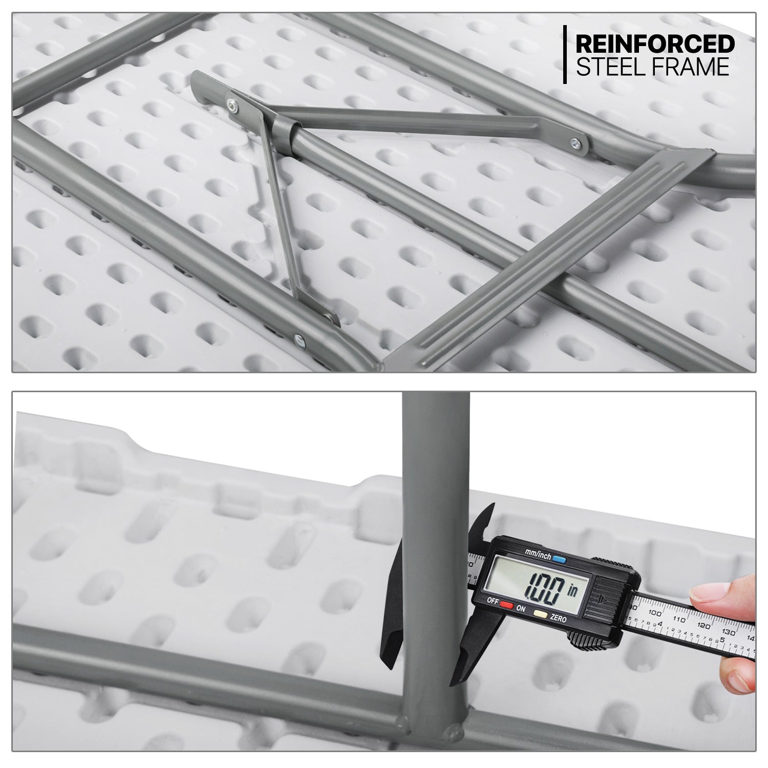 In addition, the steel frame legs provide the support needed to have our plastic folding tables stand up to heavy static loads. It is a great compact table for camping, picnics, caravanning, and for use where space is an issue.