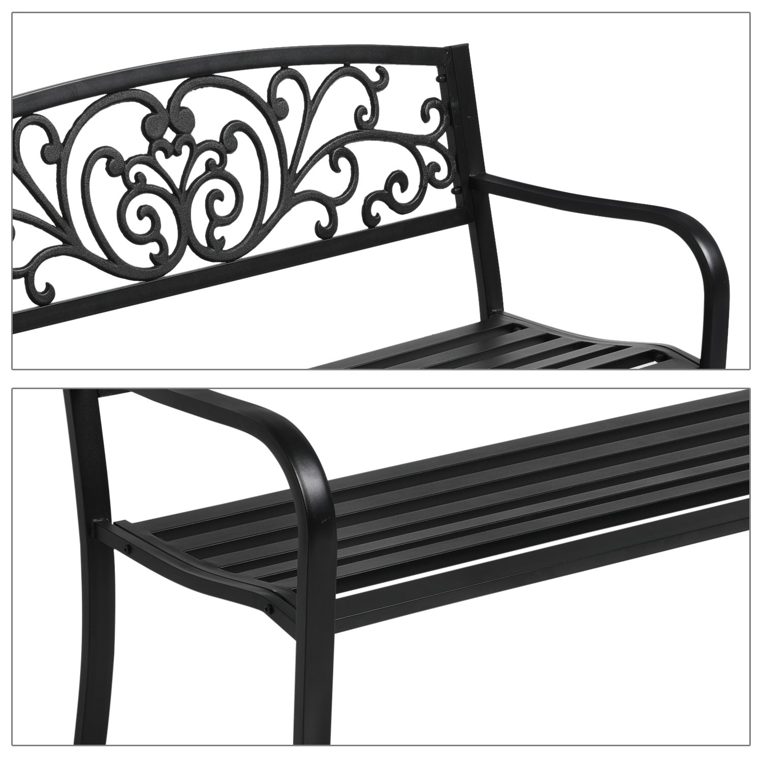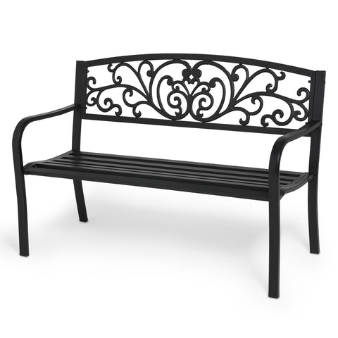 This garden bench features powder-coat steel construction to deliver durability and light weight, and the antique finish adds an attractive look to your patio or deck. The stylish design on the backrest provides a stylish look, and the bench is easy to assemble.