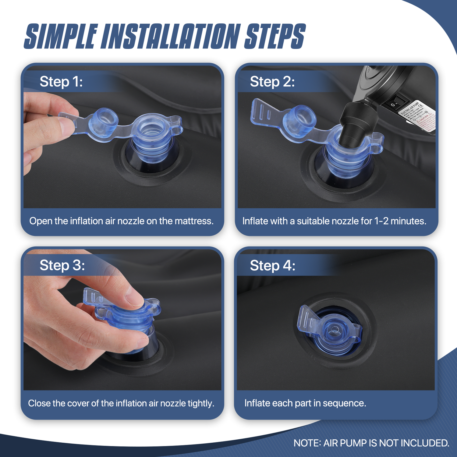 Package Included: 1 x Inflatable Car Mattress, 1 x Repair Kit (Air pump is not included)